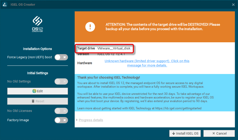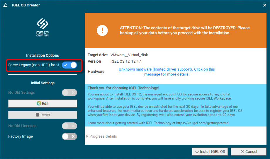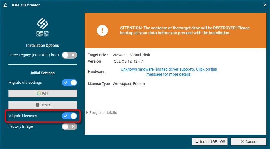 If IGEL OS 12 has been running on the device before and you want to preserve the device's settings, ensure that Migrate old settings is enabled.