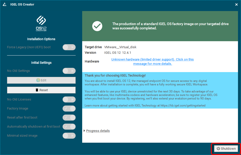 The system will shut down and then boot IGEL OS 12.