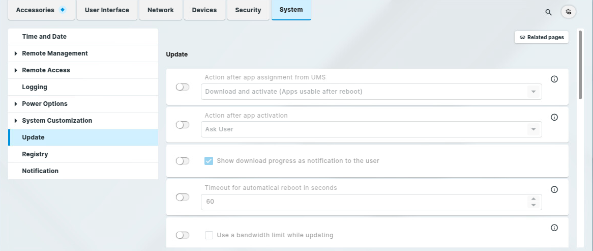 Download only (additional step is needed to activate new app(s)): When an app is assigned to the device, it will be downloaded immediately. It will be installed when the UMS sends an update command to the device. The device will then reboot; afterward, the app can be used.