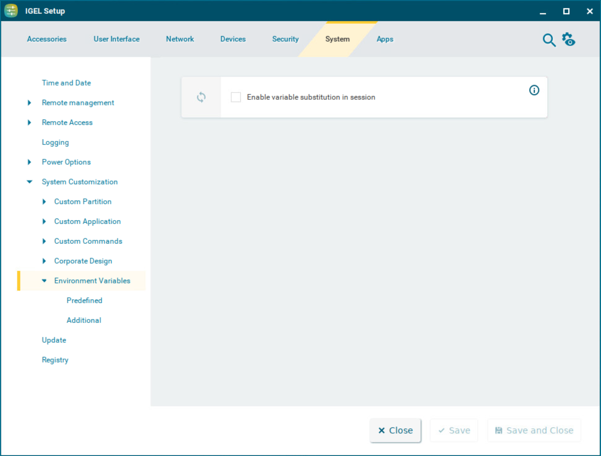 Environment variables allow you to use dynamic parameter values for a number of session types, e.g. so as not to have to enter ICA or RDP servers for every session. Predefined variables can also be allocated and distributed via the IGEL UMS. Additional variables can only be used locally on the device and may be overwritten by a UMS configuration.