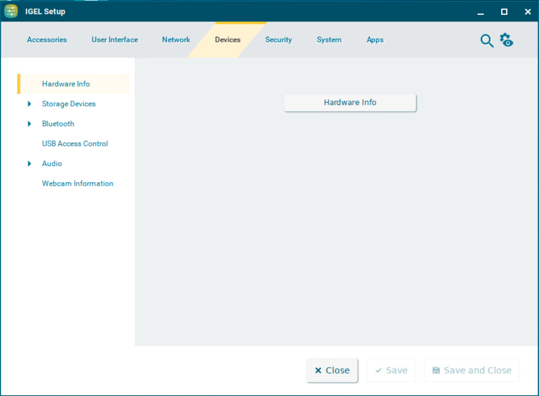The Hardware info button provides quick access to information about the endpoint device and the connected devices.