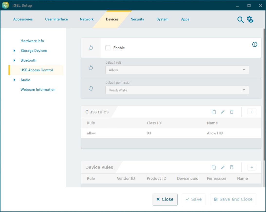 The activation of USB Access Control and setting the Default rule to Deny will block the use of USB devices locally and in the session and, thus, might disable devices needed for the users. Therefore, activate the USB access control only if your security policy requires that. In this case, set Default rule to Deny and configure Allow rules for the required USB devices and USB device classes.