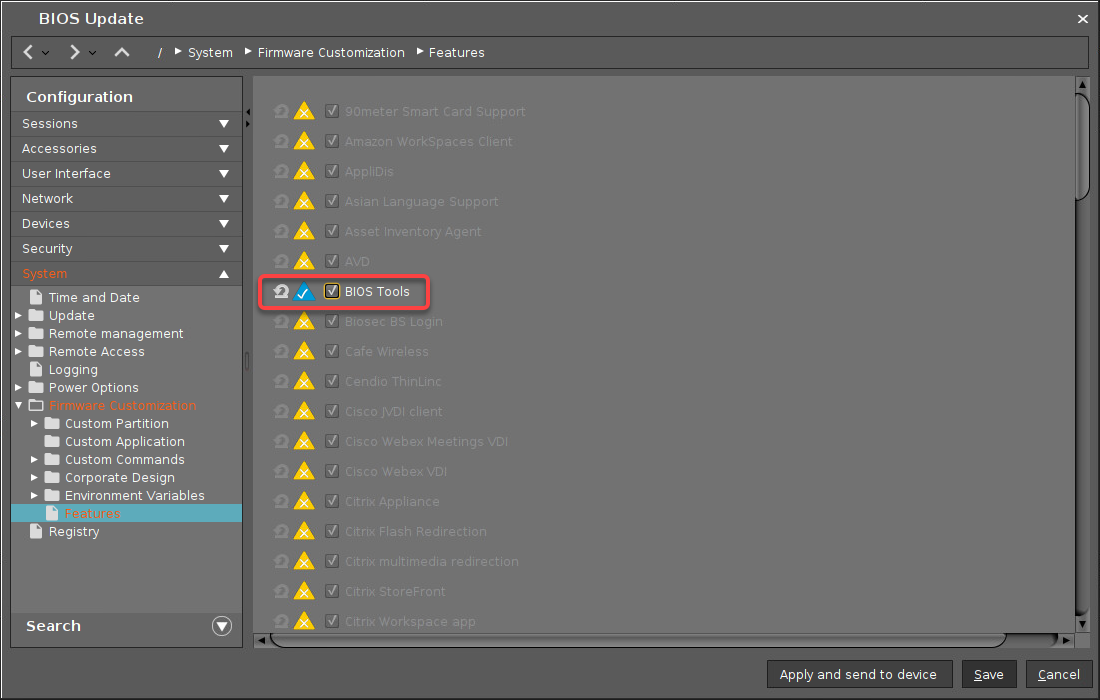 Go to System > Firmware Customization > Features and click the yellow icon beside BIOS Tools to activate the parameter (turns blue when active).