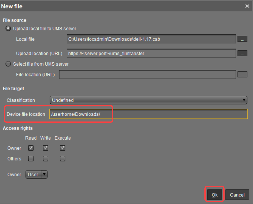 In the field Device file location, define the local path in which the file will be stored on the device, e.g.