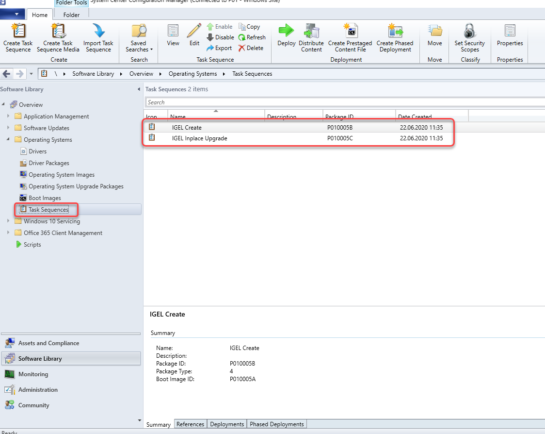 - Go to Task Sequences and check if IGEL Create and IGEL Inplace Upgrade are available. These task sequences will drive and control the deployment process.