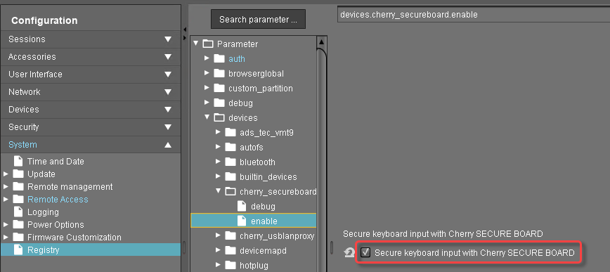 In the configuration dialog of the profile, go to System > Registry > devices > cherry_secureboard > enable and activate Secure keyboard input with Cherry SECURE BOARD (registry key: devices.cherry_secureboard.enable). (From UMS 6.03.130 or higher, the parameter can be found under User Interface > Input > Keyboard)