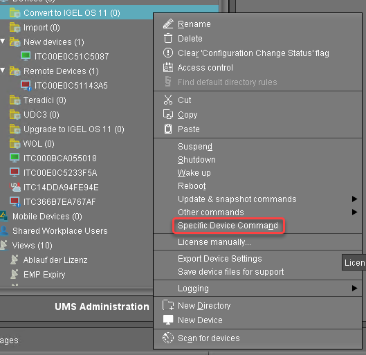 1. Select the directory that contains your target machines, open the context menu, and select Specific Device Command.