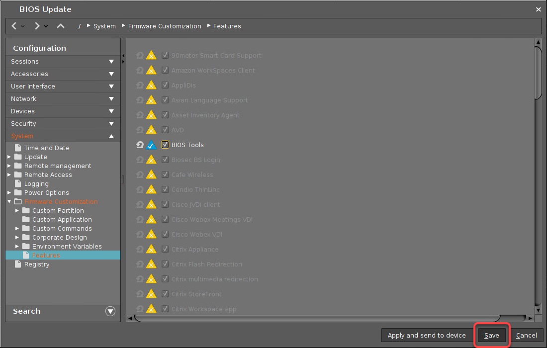Go to System > Firmware Customization > Features and click the yellow icon beside BIOS Tools to activate the parameter (turns blue when active).