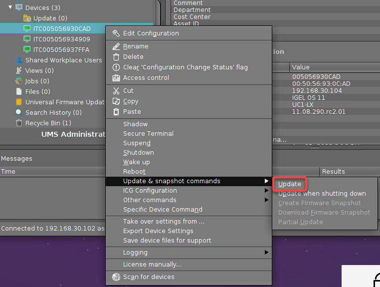 Alternatively, you can trigger the BIOS update manually. For this purpose, select Specific Device Command from the context menu of the device or the corresponding directory and then select BIOS - Trigger update: