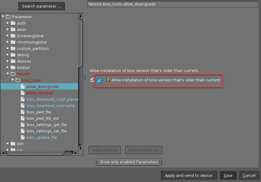 If you want to downgrade the BIOS, i.e. replace the BIOS with a lower version: Click the yellow icon and activate System > Registry > fwtools > bios_tools > allow_downgrade.