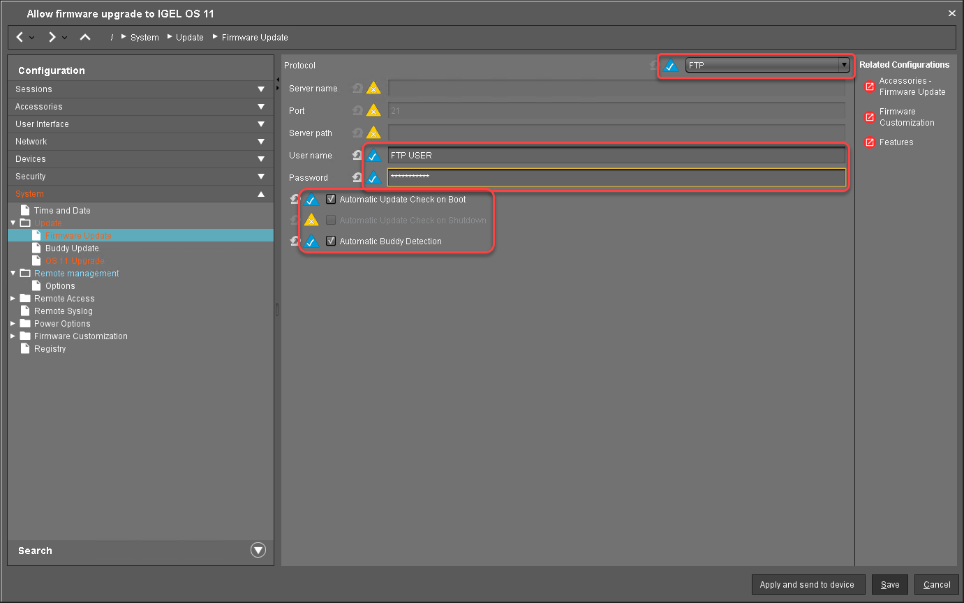 2. In the profile's configuration dialog, go to System > Update > Firmware Update and change the settings as follows: