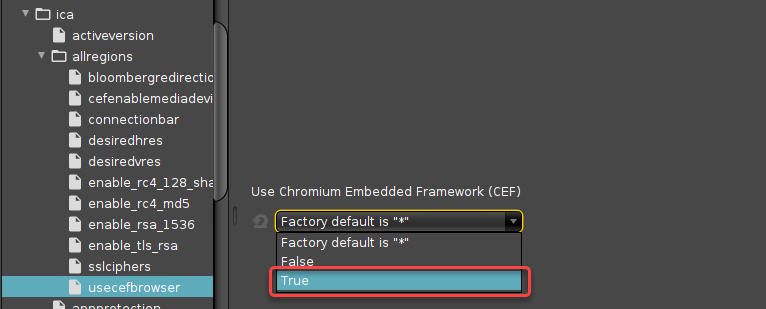 System > Registry > ica > allregions > usecefbrowser > Use Chromium Embedded Framework (CEF) is set to "True".