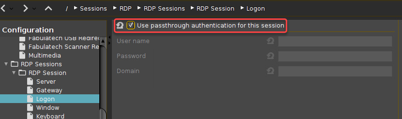 1. Go to Sessions > RDP > RDP Sessions > [name of your RDP session] > Login and enable Use passthrough authentication for your session.
