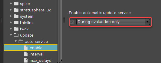 - In the UMS configuration dialog or the local Setup, go to System > Registry > update > auto-service > enable and ensure that Enable automatic update service is set to "During evaluation only".