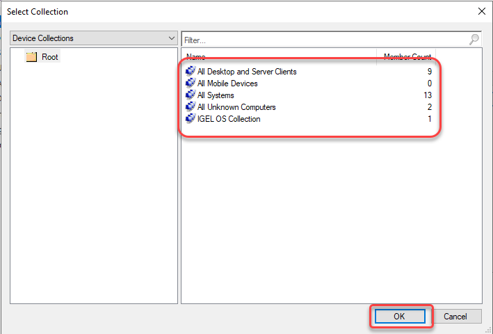 The Select Collection dialog opens. From the list of collections, select the collection that contains your target devices and click OK.