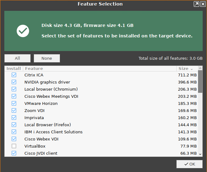 If you want to exclude features of IGEL OS, e.g. to save storage space, click Feature Selection and edit the settings as required.