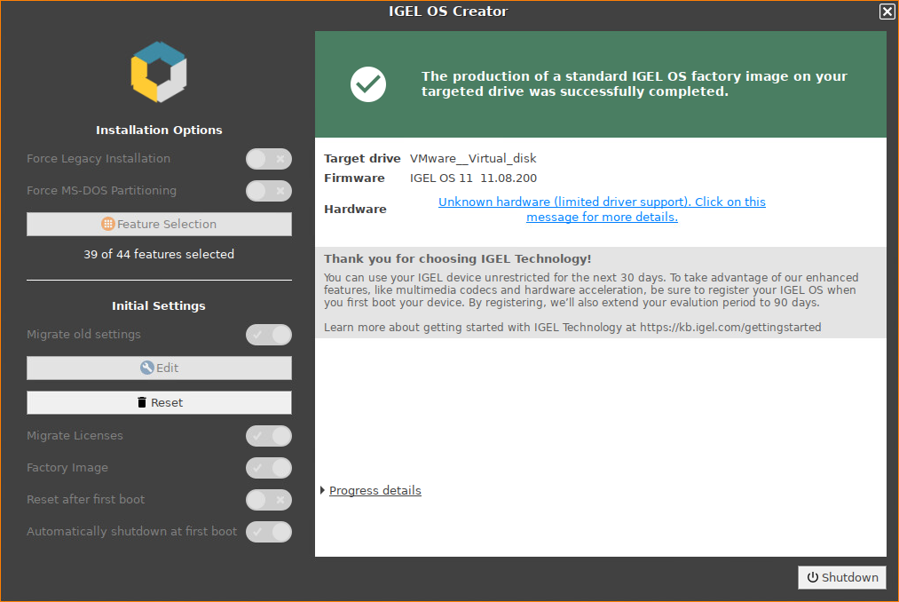 You can regularly access IGEL OS and perform your tests.Shut the device down.
