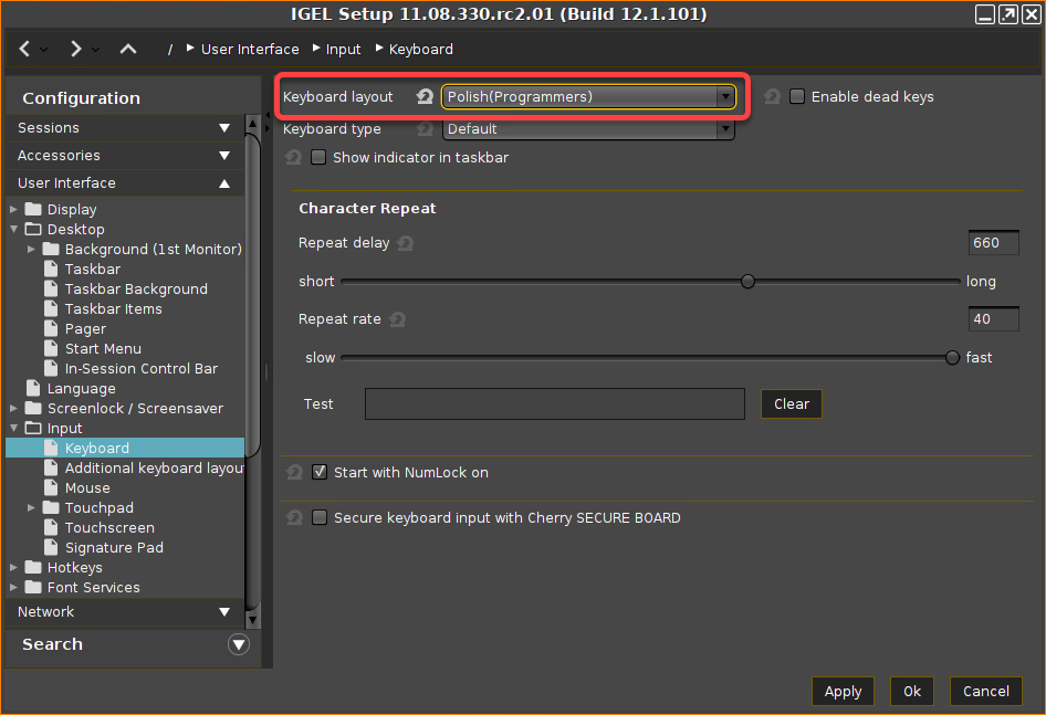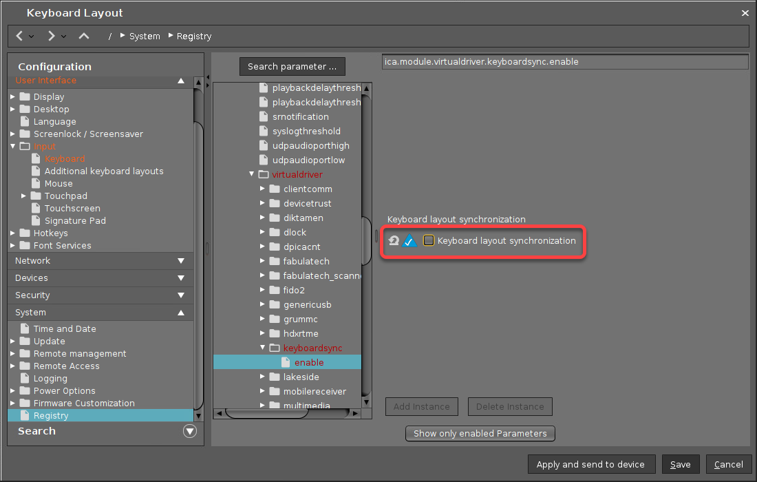 Go to System > Registry > ica > wfclient> keyboardsyncmode, set Configure keyboard layout synchronization to Once, and then confirm your settings with Save.