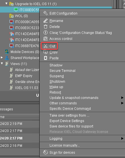If no IGEL OS 11 licenses have been deployed on the devices yet, the licenses are deployed within a few minutes. The upgrade will be started when the licenses are deployed. The maximum time period a device will wait for a license is configured by the parameter Timeout waiting for OS 11 license to start automatic upgrade; for details, see Creating an Upgrade Profile, step 8.