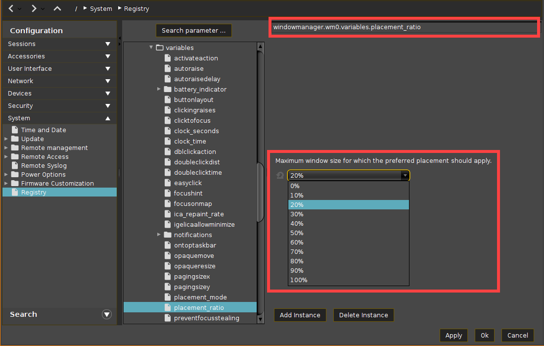 windowmanager.wm0.variables.placement_ratio.Specify a higher percentage value under Maximum window size for which the preferred placement should apply. This entry refers to the total work area.