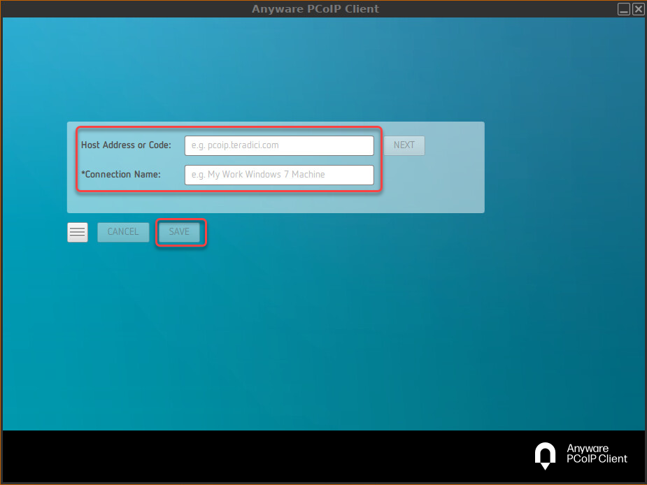 The Anyware PCoIP Client dialog opens.Enter the Host Address or Code that has been sent to you in the welcome e-mail from Amazon WorkSpaces.