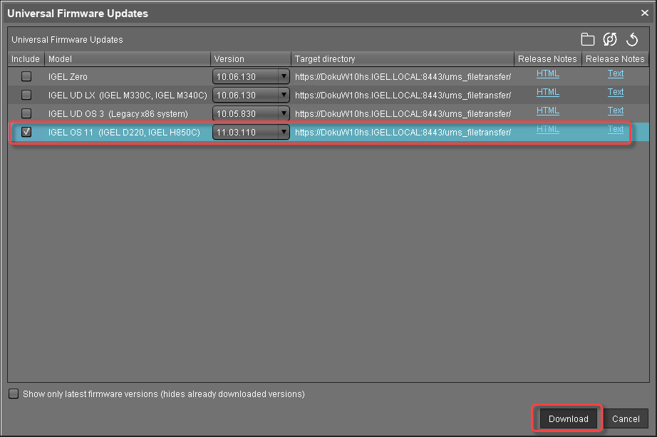 Select the entry for the IGEL OS 11 firmware and then select Download. (In the example, IGEL OS 11.03.110 is used.)