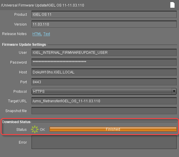 When the status is Finished, your Universal Firmware Update is ready for use.