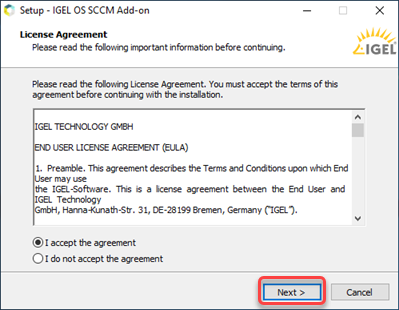 setup-igel_os-sccm_add_on_[version].exe) to the host on which Microsoft Endpoint Configuration Manager is running. - Start the executable file.