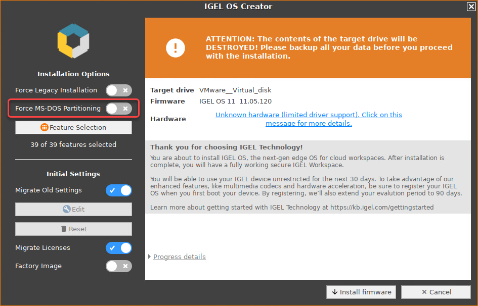 This article describes the regular installation procedure for single devices with the IGEL OS Creator (OSC). If you are an IGEL third-party endpoint partner (i.e. hardware manufacturer, independent hardware vendor, reseller) that has a factory ID from IGEL, please refer to Installation Procedure for Factory Images.