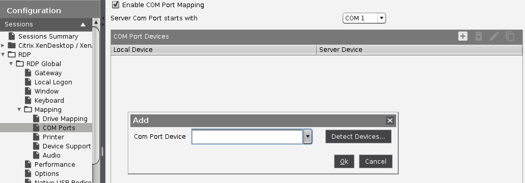 Click Sessions > RDP > RDP Global > Mapping > COM Ports for RDP.