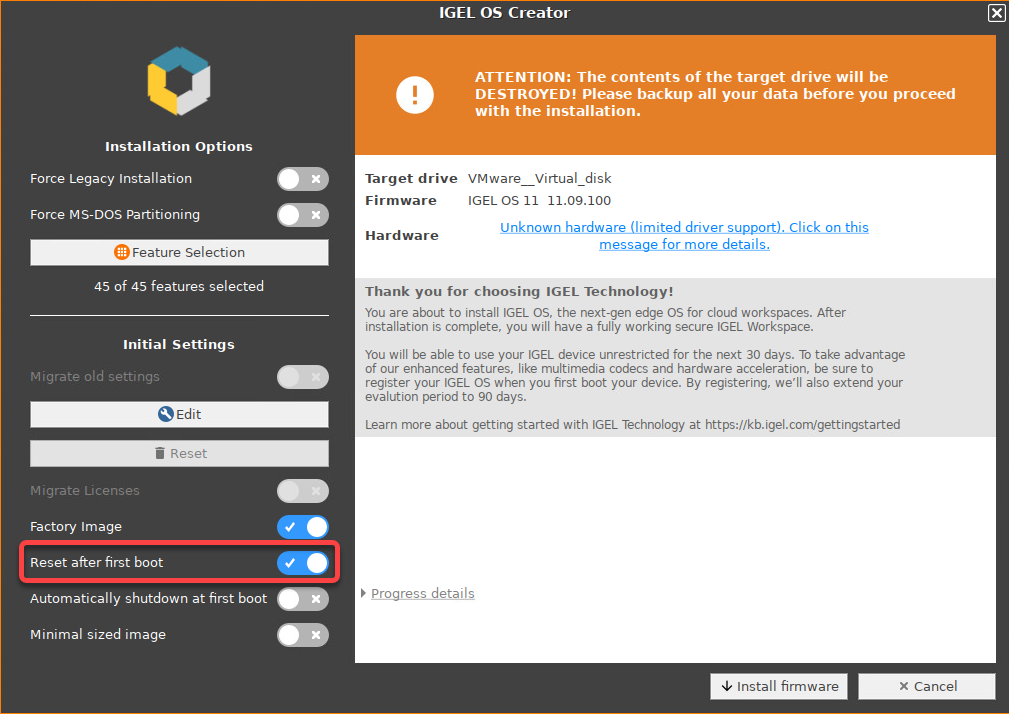 The installation program IGEL OS Creator opens. Here, you can configure settings for the installation process and start it.Optional; only available if your device has booted in UEFI mode: If you want to install the legacy/BIOS version of IGEL OS 11, activate Force Legacy Installation.