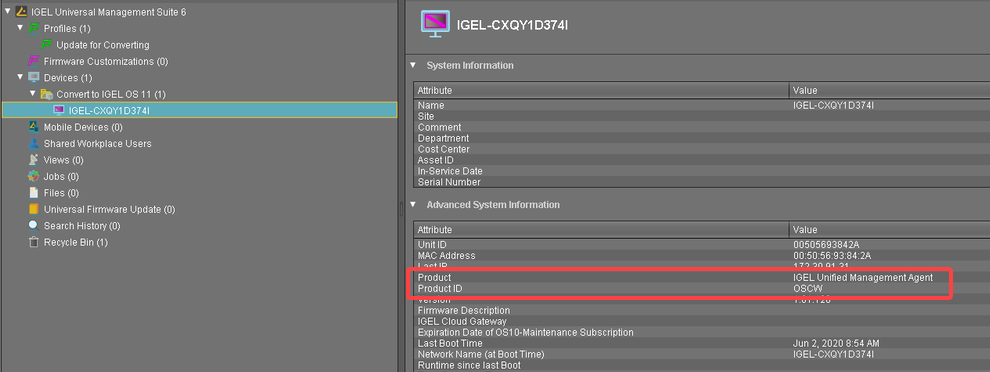 In the Advanced System Information area, Product is set to "IGEL Unified Management Agent", and Product ID is set to "OSCW".