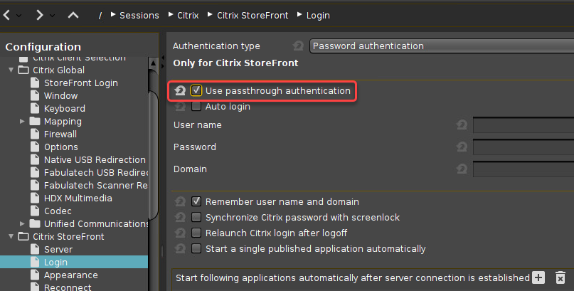1. Go to Sessions > Citrix > Citrix StoreFront > Login and enable Use passthrough authentication.