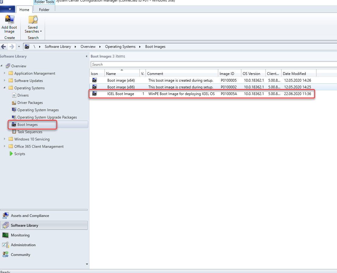 - In the Home tab of the Endpoint Configuration Manager, go to Boot Images and check if the IGEL Boot Image (WIM) is available.