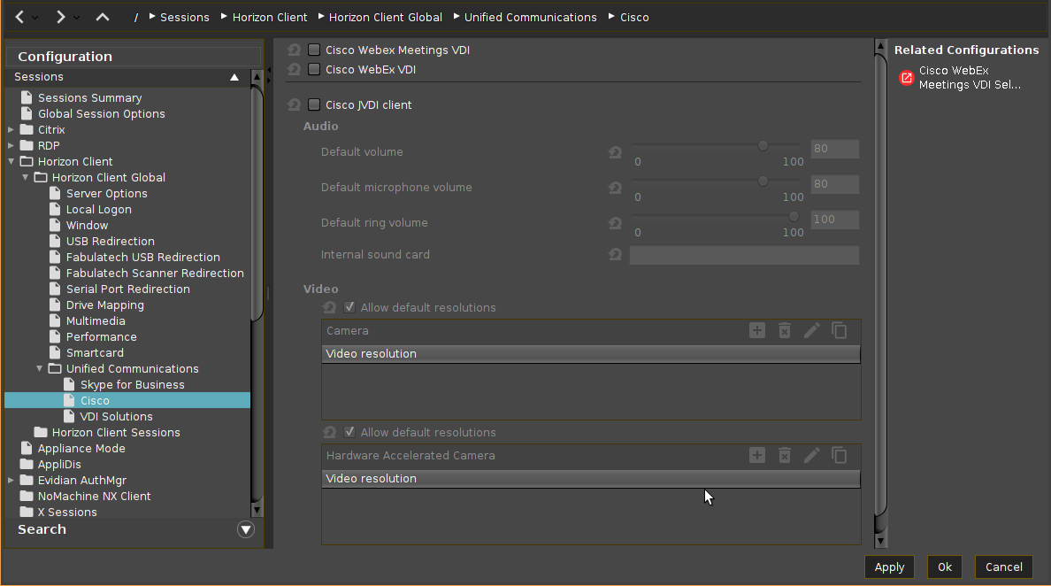 Here you can activate or deactivate the virtual desktop optimization for Cisco Webex and define settings for the Cisco JVDI client.