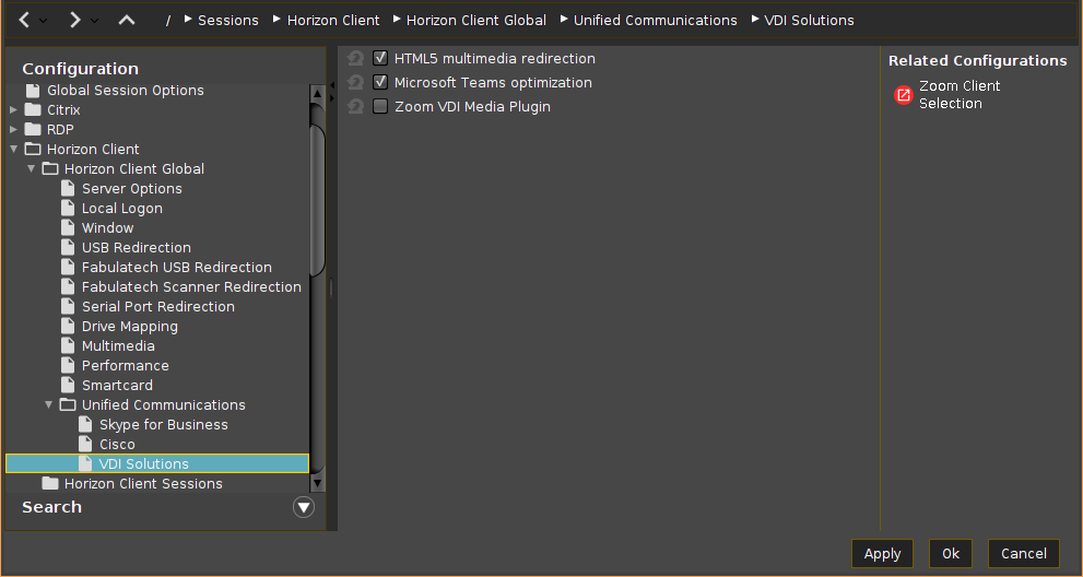 Menu path: Sessions > Horizon Client > Horizon Client Global > Unified Communications > VDI Solutions