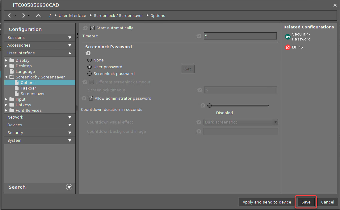 If you want a screen lock after a defined time of inactivity, go to User Interface > Screenlock / Screensaver > Options and edit the settings as follows: