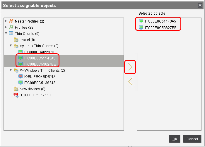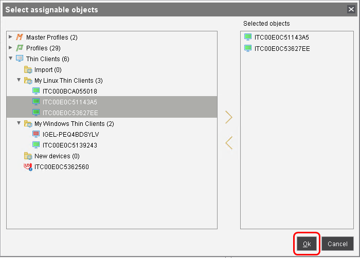 2. In the Select assignable objects dialog, select the thin clients to which you want to assign the new key mapping and add them to the Selected objects area.