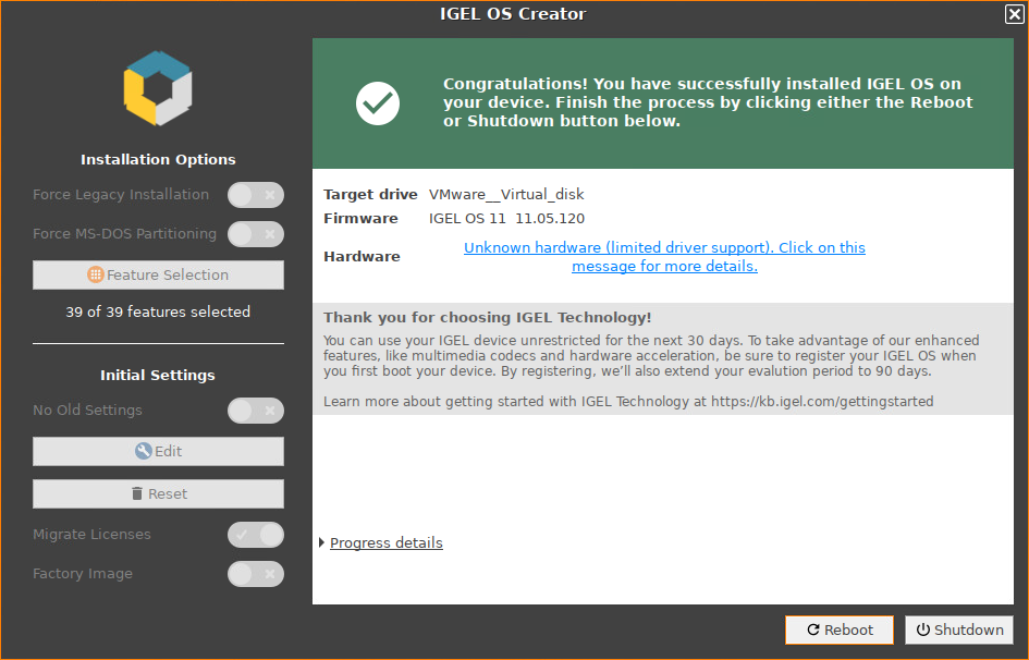 The installation program will install IGEL OS 11 on the target drive. If you see the success message, the installation is complete.