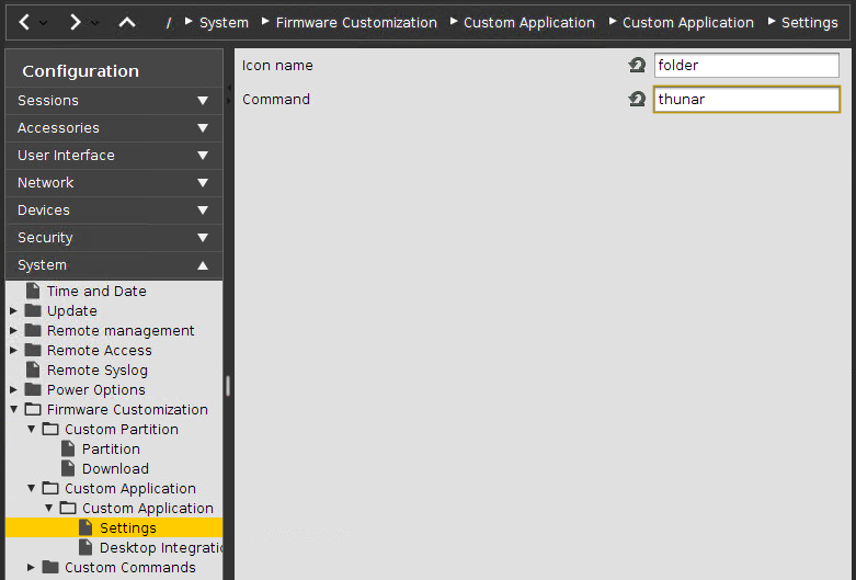 folderas the Icon name andthunaras the Command in the Settings dialog: