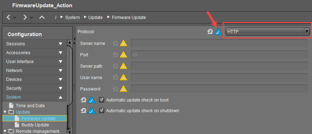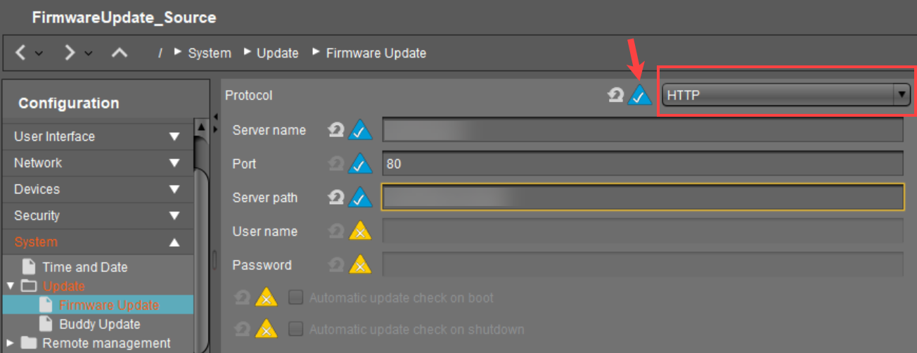 If several profiles are used to configure the firmware update, make sure that ALL these profiles have the Protocol parameter activated and the same protocol is selected.