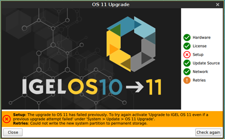 The OS 11 Upgrade Tool shows the error messages. The most important message is prefixed with Retries; see the example below:
