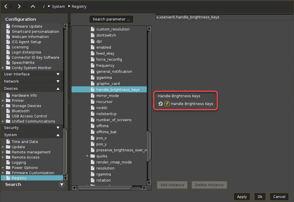 In the Profile Configurator or local Setup, enable System > Registry > x > xserver0 > handle_brightness_keys. (Registry key: x.xserver0.handle_brightness_keys)