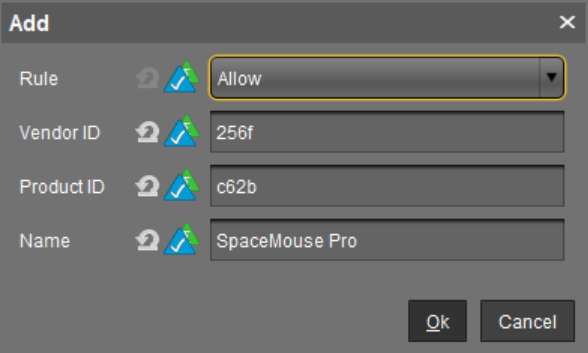 4. Add a device exception rule as in the following screenshot with the Vendor ID and Product ID of your specific SpaceMouse: