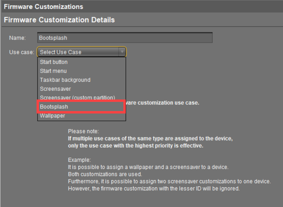 The Firmware Customization Details dialog opens.Enter a Name for your bootsplash customization.
