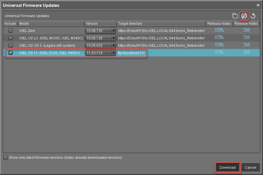 Select the entry for the IGEL OS 11 firmware and then select Download. (In the example, IGEL OS 11.03.110 is used.)