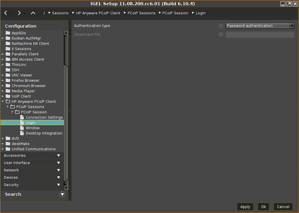 PIN required for smartcard authentication; only valid if Authentication type is set to Smartcard authentication.