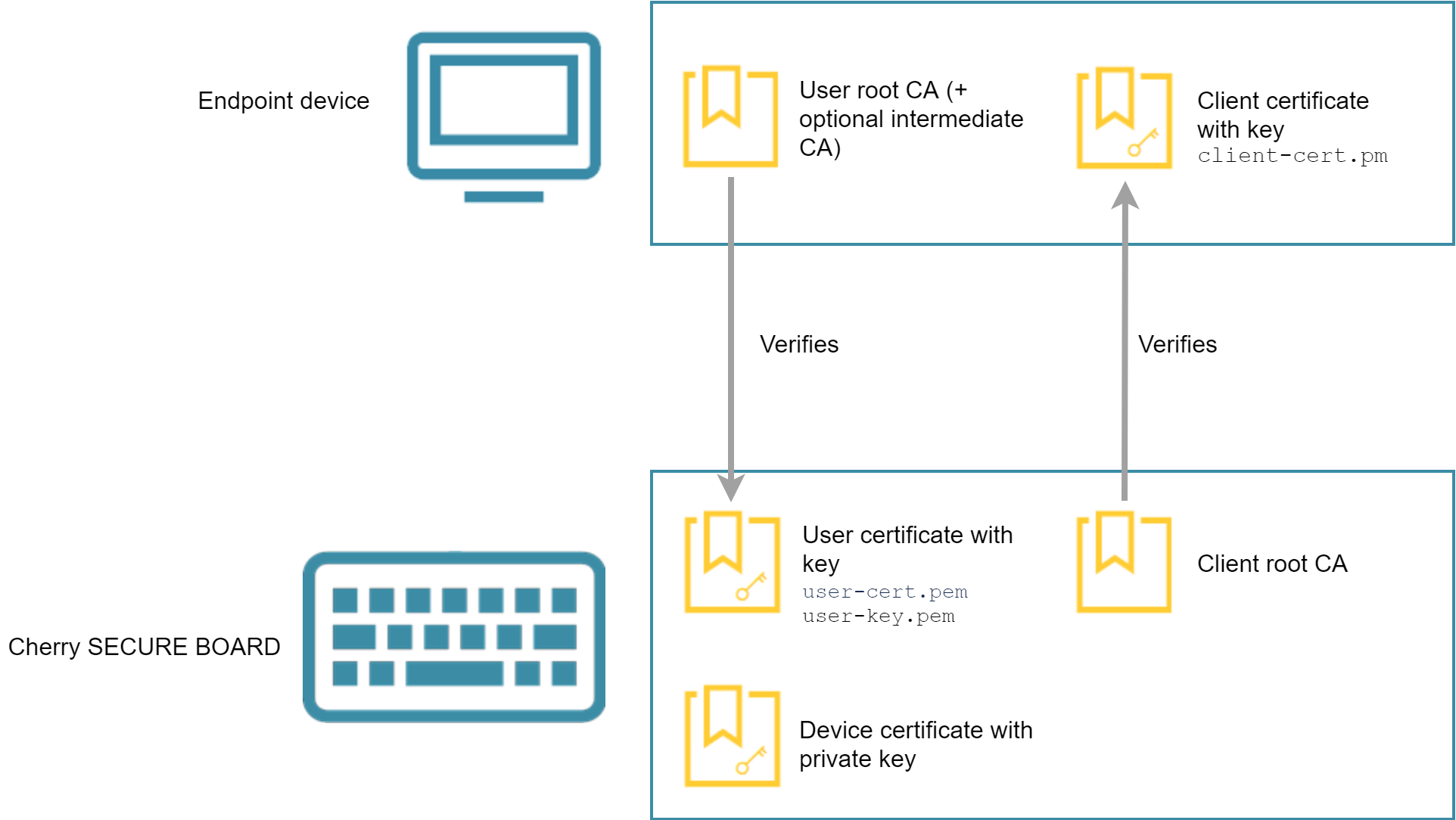 The endpoint verifies if the Cherry SECURE BOARD has the right certificates. When the optional client certificates have been installed, too, the Cherry SECURE BOARD verifies if the endpoint has the right certificates. When everything went well, the endpoint and the Cherry SECURE BOARD work in secure mode.