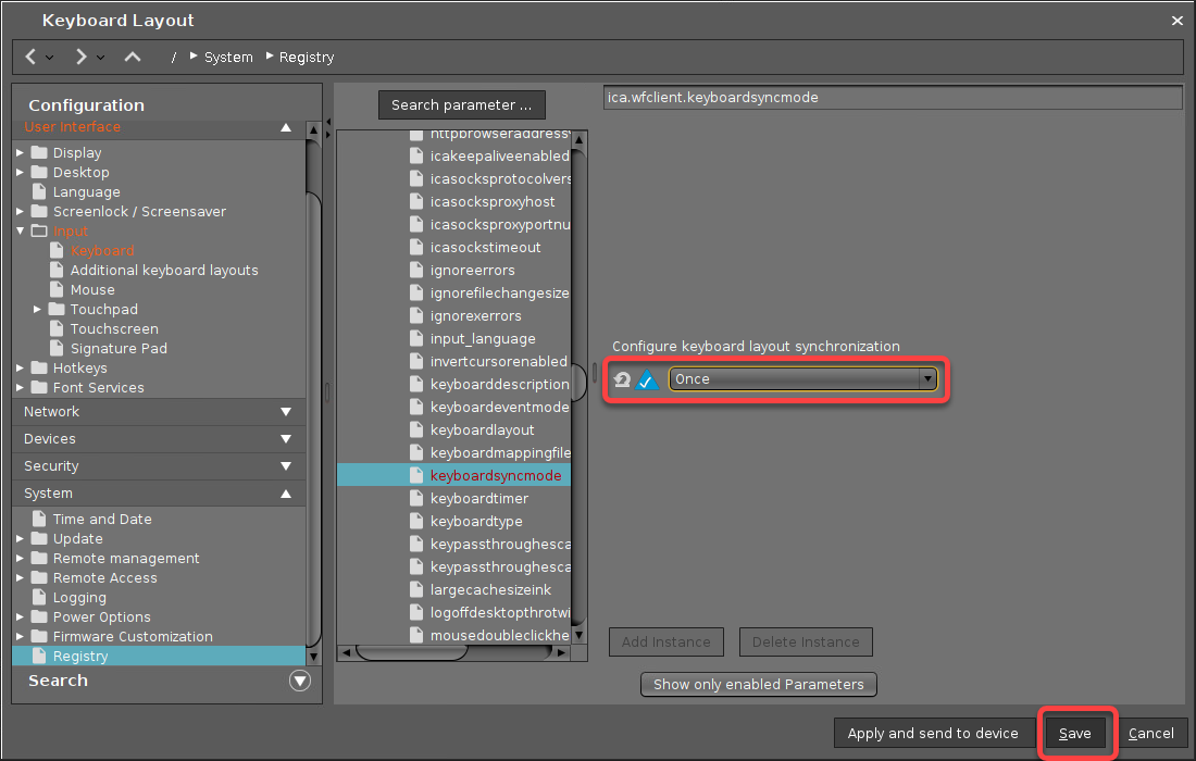 Go to System > Registry > ica > wfclient> keyboardsyncmode, set Configure keyboard layout synchronization to Once, and then confirm your settings with Save.