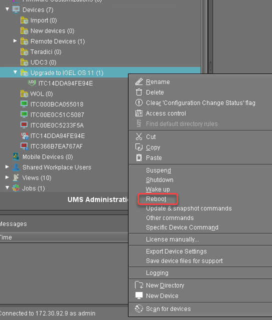 The parameter Automatic update check on boot makes the devices look for new firmware again. Although two Universal Firmware Updates are assigned to the devices, the UMS offers the IGEL OS 11 firmware, because the ID of the IGEL OS 11 firmware is higher than the ID of the IGEL OS 10 firmware.